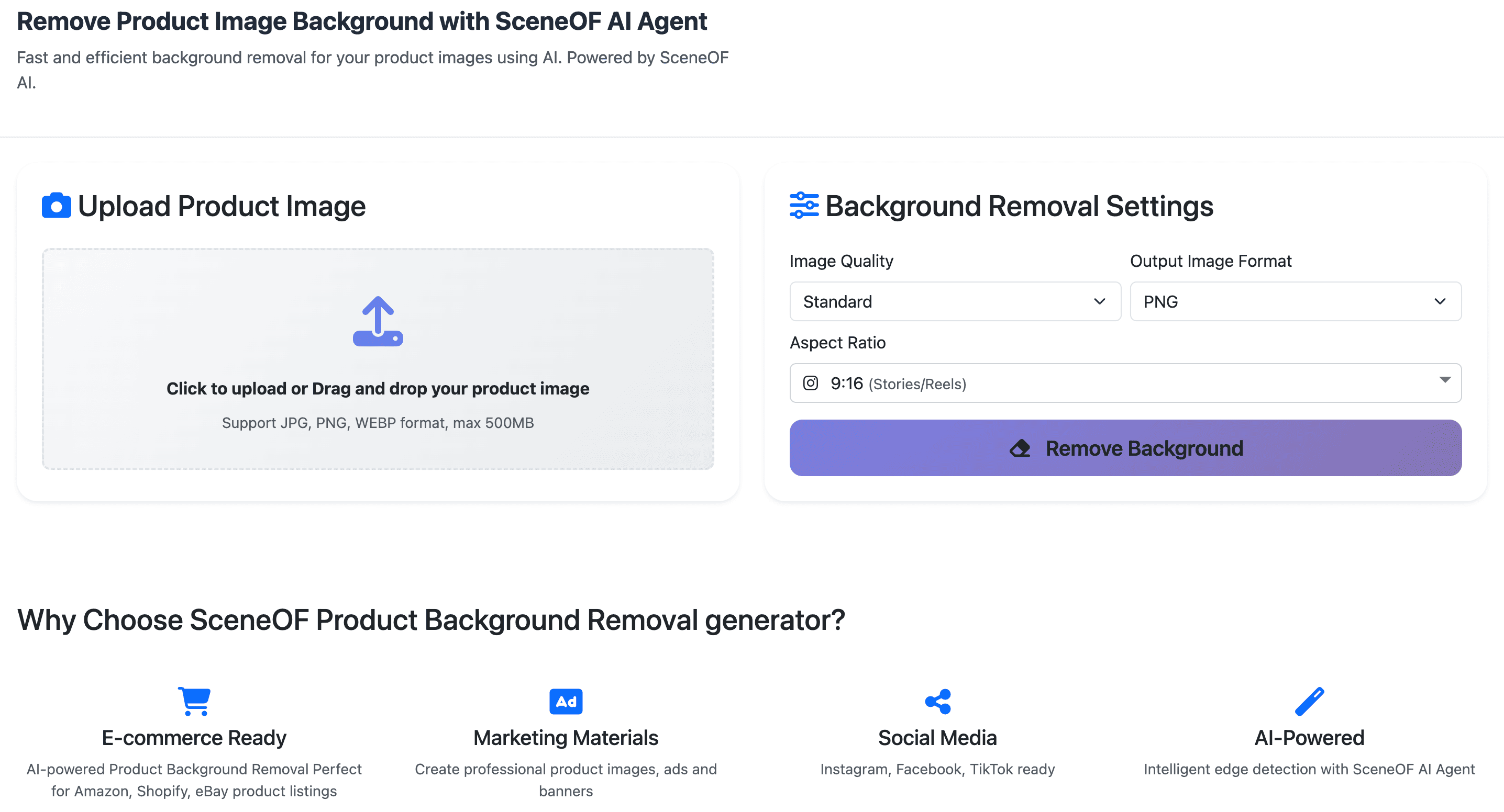 Navigate to https://sceneof.com/product-background-removal. The interface is straightforward and designed for quick, professional results.
